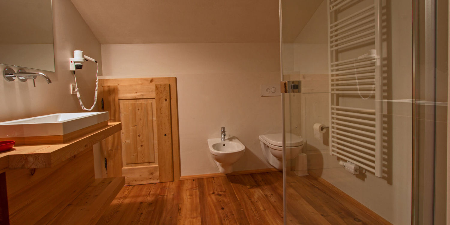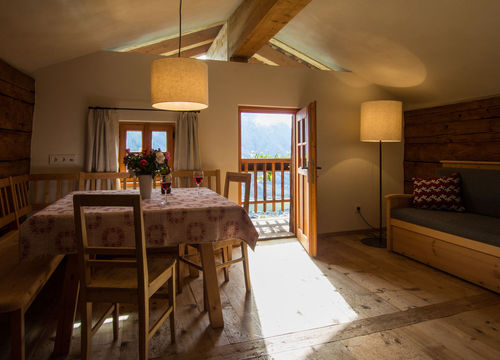 Soggiorno in legno massiccio con banca d ´angolo e couch, uscita diretta all balcone piu alto della casa (vista Valle) . Camera da letto sempre in legno massiccio e anche una uscita al balcone verso monte. Bagno in larice. La cucina si trova tra camera e soggiorno.